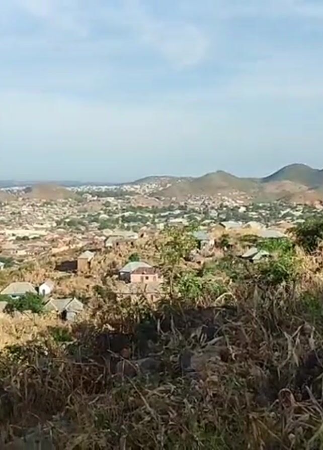 panoramic view of a densely populated town from an elevated vantage point. The foreground is characterized by dry, brown vegetation and scattered rocks. A few small trees dot the hillside. The town in the background is comprised mainly of closely-packed, single-story buildings, mostly with corrugated metal roofs. Hills rise in the distance beyond the town, adding depth to the landscape. The sky is a pale blue with wispy clouds. In the audio, a child's voice can be heard.
