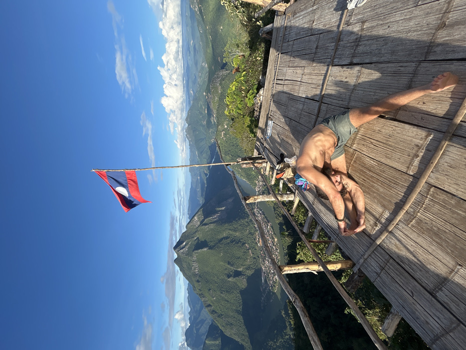 An elevated outdoor viewpoint in Nongkhiao-Nua, Laos, is depicted under clear blue skies with scattered white clouds and bright sunlight. In the foreground, a barefoot adult male, shirtless and wearing olive-green shorts, performs a deep yoga or stretching pose on a rustic bamboo-slat platform. He is bent forward over his extended right leg, with his left leg bent and foot near his groin, and his hands are clasped or holding his right foot. To the upper left of the frame, a Lao national flag, featuring horizontal red, blue, and red stripes with a central white disk, flies from a tall, slender wooden pole. A simple, rough-hewn wooden railing borders the platform along the steep drop-off. The extensive background showcases a mountainous landscape with lush green peaks, including a prominent, distinctive mountain directly across the valley. The Nam Ou River is visible winding through the valley below, with the town of Nongkhiao-Nua situated along its banks.