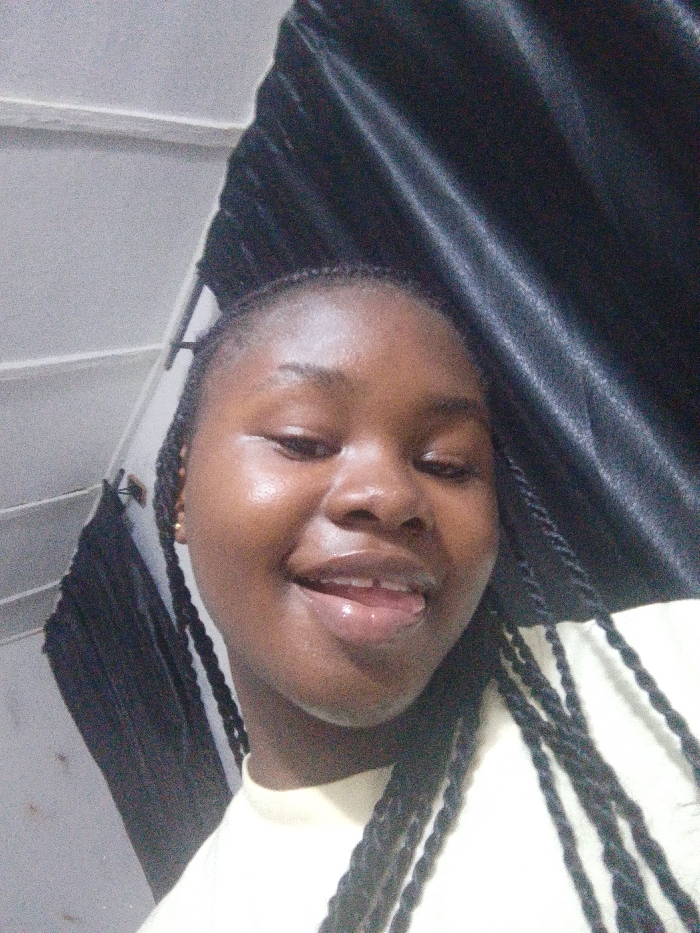 A close-up, vertical-format image depicts a young, dark-skinned female individual, framed from the upper chest upward