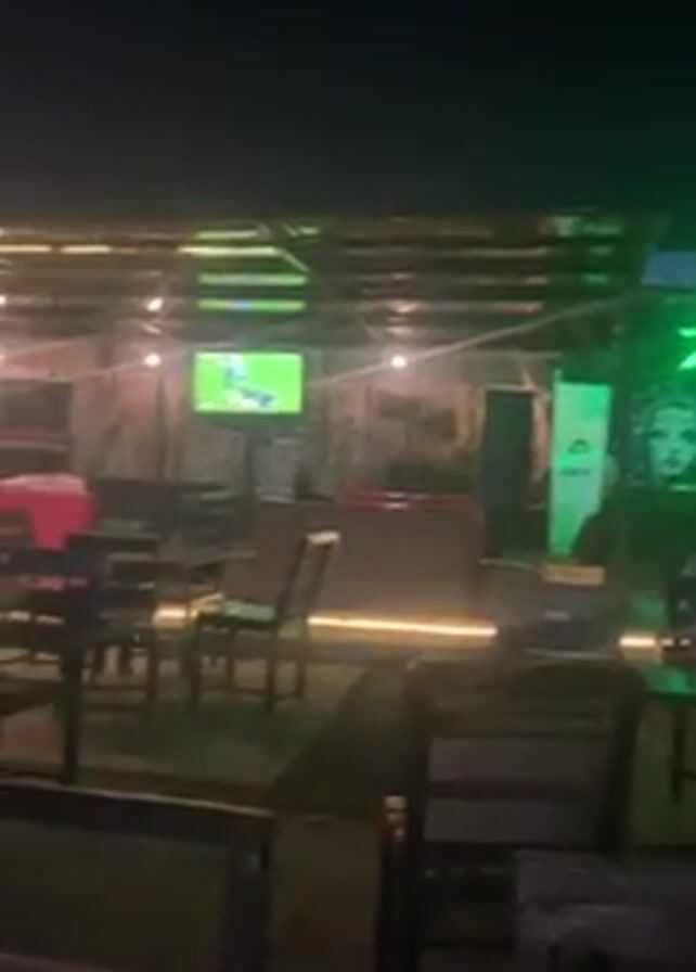 outdoor seating area of a bar or restaurant at night. Tables and chairs are visible, mostly empty. String lights and neon lighting provide illumination, with green lights prominent near a wall display featuring a painting or print. A television screen shows a sporting event, possibly soccer, on the left side of the frame. In the background, a DJ booth is visible, and speakers suggest music or entertainment is a feature of the space. The overall atmosphere is festive and relaxed.