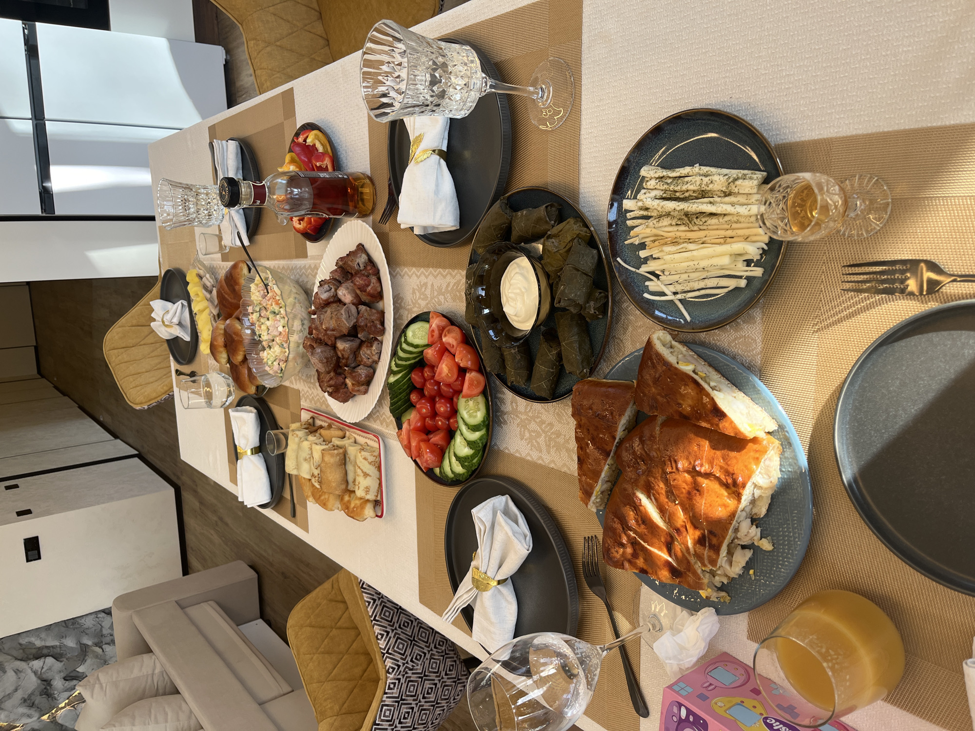 The image depicts a dining table laden with a variety of dishes and beverages, set in a modern residential interior in Новая Чернушка, Russia. The table is covered with a white tablecloth and tan striped placemats. Centered on the table are numerous food items. These include a large white plate of cooked meat chunks (possibly shashlik), a clear bowl of what appears to be Olivier salad, a plate of rolled blini or crepes, and a plate of baked goods resembling buns or croissants. A dark plate holds a portion of sliced savory pie, and another dark plate contains dolma (stuffed grape leaves) accompanied by a small bowl of white sauce. Freshly cut tomatoes and cucumbers are arranged on a black plate. Another plate features two types of cheese sticks, some plain and some sprinkled with dill. Small side dishes include pineapple chunks and sliced red and yellow bell peppers. Beverages present include a clear glass bottle containing an amber liquid (likely an alcoholic spirit), a glass of orange juice, and several empty clear drinking glasses, including wine glasses and a shot glass. Table settings consist of dark grey/black plates, white cloth napkins secured with gold napkin rings, and silverware (forks and knives). The background reveals a modern living or dining space. A beige sofa with light pillows is visible on the left. Several yellow upholstered dining chairs with quilted patterns, some featuring a geometric black and white pattern on their sides, are arranged around the table. The flooring is a light wood-look material. White walls and a large white refrigerator/freezer appliance are seen in the distance, with a textured grey wall paneling detail also visible. Natural light enters the room, casting shadows on the table surface. No people are visible in the scene.