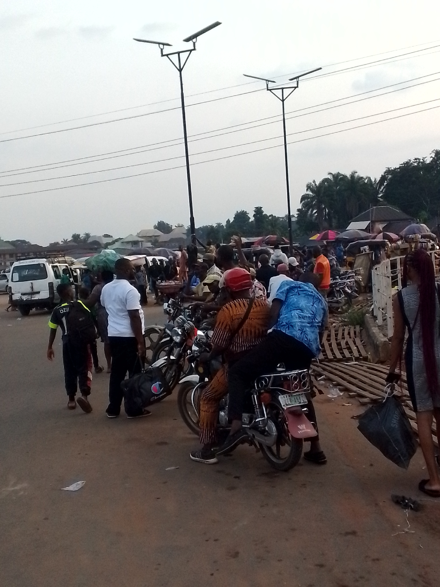 The image depicts a bustling scene at a market in Orlu, Nigeria. The foreground shows a paved street with litter. A motorcycle is parked with two people seated on it. One person wears an orange and brown patterned shirt, while the other wears a blue floral shirt. A woman walks past with a black shopping bag. A young boy is walking away from the camera wearing a sports jersey with the number one on the back. A man in a white shirt and black trousers is standing with a Champion branded bag. In the background, a white van is parked near a throng of people and umbrellas, suggesting a crowded market area. Streetlights stand tall with visible wires overhead. The sky appears overcast. The overall scene suggests a typical day at a busy market.