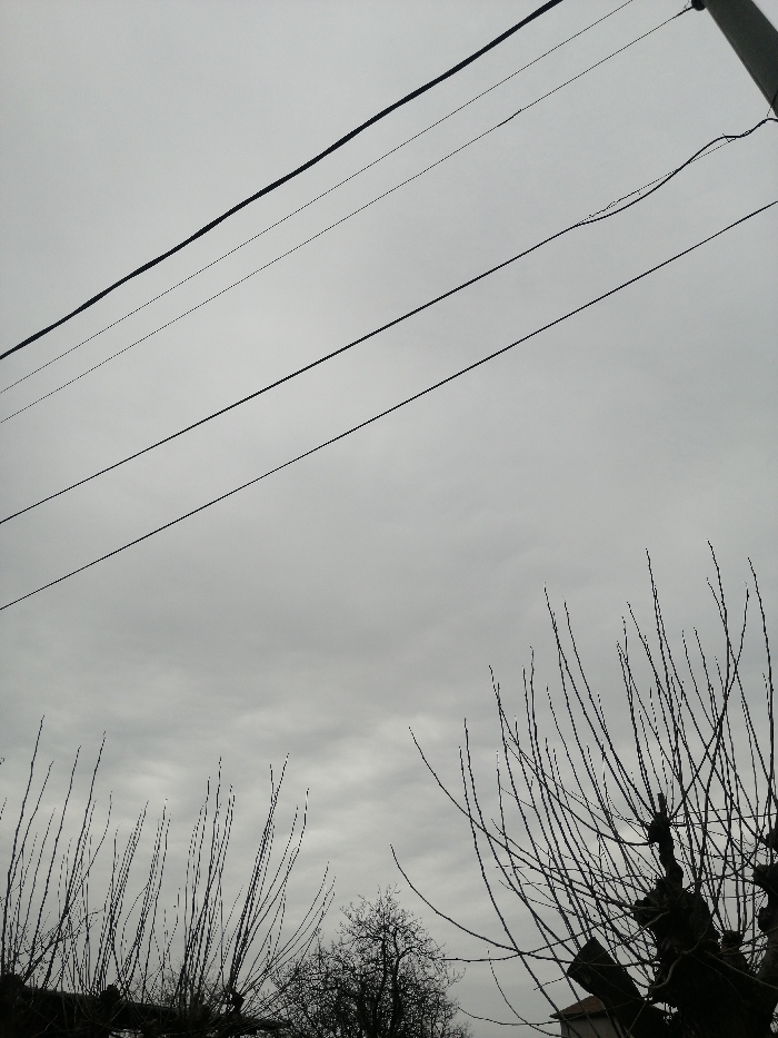 The image displays an exterior scene in Galabovo, Bulgaria, under a uniformly overcast, light grey sky. Four dark-colored linear elements, identified as electrical or communication lines, traverse the upper portion of the frame diagonally from the upper-left to the upper-right. A segment of a utility pole is visible in the upper-right corner, supporting some of these lines. The lower half of the frame features the silhouettes of multiple leafless deciduous trees. Prominent in the lower-left and lower-right are trees exhibiting numerous short, upward-pointing branches, characteristic of pollarding. A denser, naturally branched leafless tree is visible in the lower-center background. A section of a light-colored building with a partial reddish-brown roof is discernible in the bottom-right corner, partially obscured by tree branches. No human figures or discernible activities are present.