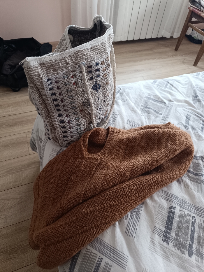 In Cherkovitsa, Bulgaria, a beige woven bag with multicolored geometric patterns and an unzipped top closure is observed standing upright on a bed. To its immediate front and right, a folded rust-orange knitted sweater with visible textured stitching lies flat on the bedsheet. The bedsheet is white with a repeating pattern of thin, irregular grey horizontal and diagonal lines. The background includes a light-colored laminate floor, a white vertical panel radiator mounted on a light-colored wall, and a partial view of a wooden chair and a dark object (possibly another bag or clothing pile) on the floor. No individuals are present, and no active interactions are depicted.