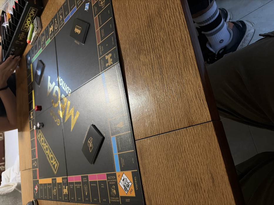 - "The image displays an overhead view of a Monopoly Gold Mega Edition board game actively set up on a wooden table, located in a residential setting in Ribaritsa, Bulgaria" by FM-sGIH73, licensed under CC BY 4.0