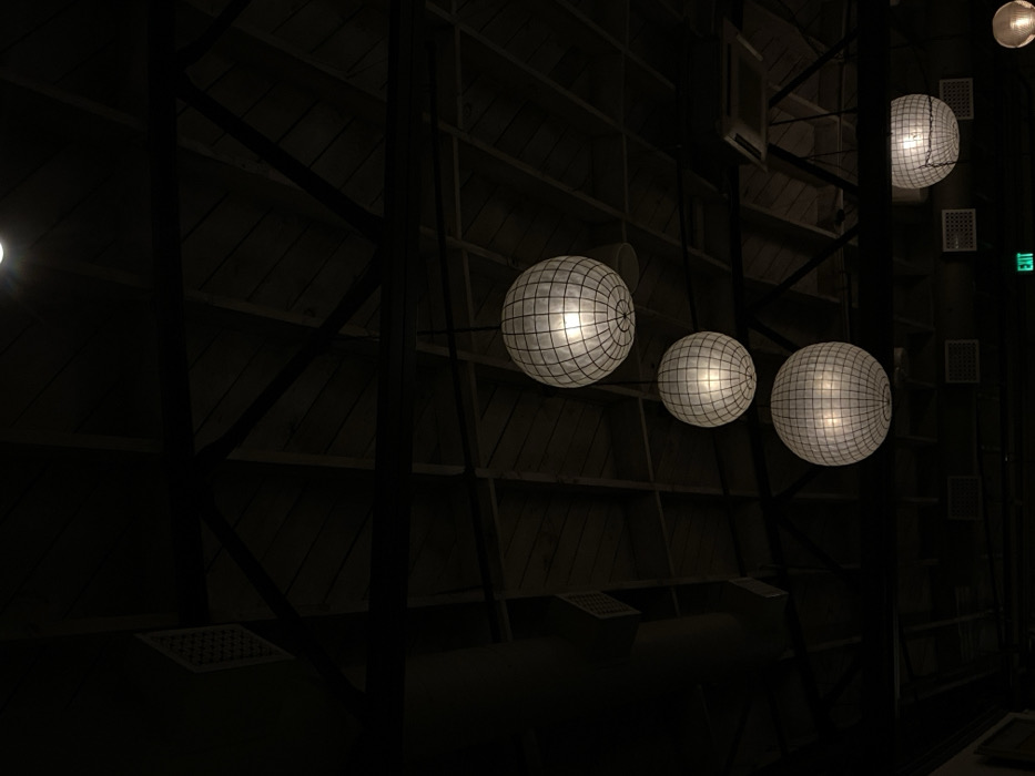 - "A dark interior shows spherical, white, patterned lamps hanging from the ceiling" by FM-G9oSF3, licensed under CC BY 4.0