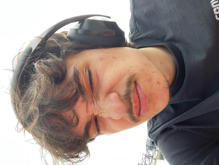 A close-up, upward-angled portrait of a young man with brown, wavy hair, a prominent mustache, and visible facial blemishes on his cheeks and chin. He is wearing black over-ear headphones and a dark-colored crew-neck t-shirt. His eyes are squinted shut, and his nose is wrinkled, indicating a strong facial expression. The background is largely bright white, consistent with an overcast sky or bright diffuse light. A blurry, light-colored, metallic-like structure with an open lattice design is partially visible in the lower-left background. The location is the city of Bron, France.