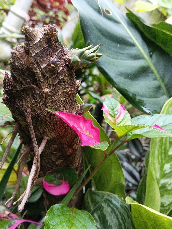 A rough, textured brown tree trunk dominates the frame. Emerging from the trunk are clusters of small green shoots with reddish tips. Vibrant pink and green leaves of a nearby plant add a pop of color, with some leaves showing a mottled pattern. Large, glossy green leaves provide a backdrop to the scene, contributing to a lush, natural environment.