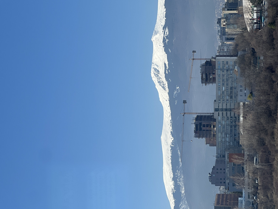 The image depicts a panoramic view of the city of Sofia, Bulgaria, set against the backdrop of snow-capped Vitosha Mountain under a clear, bright blue sky. The upper half of the frame is dominated by an uninterrupted azure sky. Below, the majestic Vitosha Mountain range spans the horizon, its peaks and upper slopes covered extensively in white snow. Darker, treed sections are visible below the snowline, fading into a light atmospheric haze that separates the mountains from the urban area. The mid-ground features the city of Sofia. Two large tower cranes are prominently visible, positioned above two distinct, multi-story high-rise buildings currently under construction, their concrete structures and scaffolding apparent. Surrounding these are numerous other multi-story buildings of varying architectural styles and ages, forming a dense urban landscape. To the far right, a building displays the visible signage "ACIBADEM," identifying a medical facility. Further to the lower right, a distinctive white, dome-like or tent-shaped structure is partially visible among the trees. The foreground consists of a band of dormant deciduous trees and bare vegetation, indicating either winter or early spring. A single white bus or large van is partially visible through the trees in the lower left section. No individuals or specific human activities are discernibly captured within the scene. The overall lighting suggests bright daytime conditions.