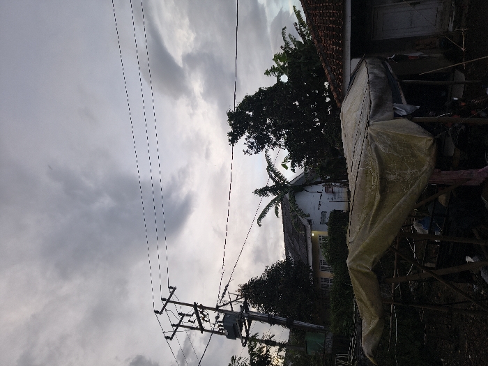 The image depicts an outdoor scene in the city of Unknown, Vietnam, under an overcast sky dominated by heavy grey clouds. In the foreground, a makeshift structure is present, covered by a wrinkled, light-colored tarp, beneath which dark, indistinct items are visible. To the immediate right, a portion of a building with a reddish-brown tiled roof and a light-colored wall with a dark door or opening is partially framed. The midground features a utility pole on the far left, equipped with a transformer and multiple overhead power lines extending across the upper portion of the frame. Dense green foliage and various trees, including a prominent palm tree, surround a light-colored residential building with a dark roof. An interior light is illuminated within one window of this building. No individuals, specific actions, or direct interactions are discernible within the frame. The environment suggests a semi-urban or residential area.