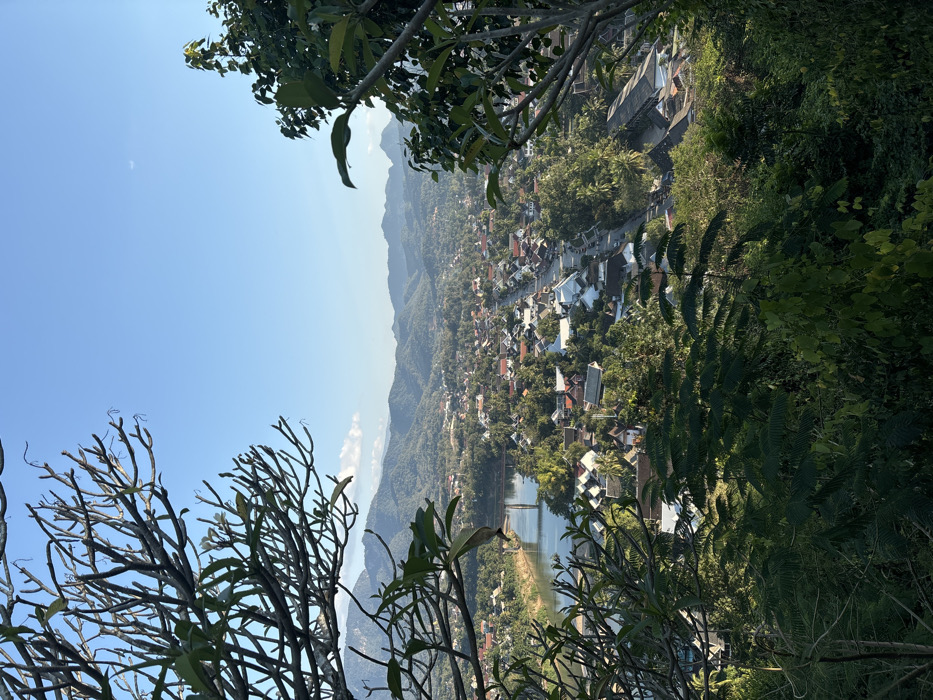 An elevated panoramic view captures the city of Luang Prabang, Laos, from a high vantage point, likely Mount Phousi, overlooking the confluence of the Mekong and Nam Khan rivers. The scene is framed in the foreground by dark, leafy tropical foliage and bare branches of trees, partially silhouetted against a bright, clear blue sky. The city extends across the midground, characterized by a dense arrangement of low-rise buildings with predominantly red-brown, grey, and white roofs, interspersed with numerous green trees and vegetation. A prominent river, likely the Nam Khan, curves from the upper left towards the lower left, its surface reflecting the clear sky. A multi-span bridge, dark in color, crosses this river, connecting the main landmass. A central road, appearing as a lighter grey ribbon, runs through the heart of the urban area, with smaller streets branching off. No individual people or specific vehicle movements are discernible from this distance. In the background, a series of undulating green mountains and hills stretch across the horizon under the expansive blue sky, gradually fading into a light atmospheric haze. The overall lighting suggests either late morning or late afternoon, with strong sunlight casting a warm glow on the landscape. A faint crescent moon is visible in the upper right quadrant of the sky. The environment is rich in natural vegetation, both within and surrounding the urban settlement.
