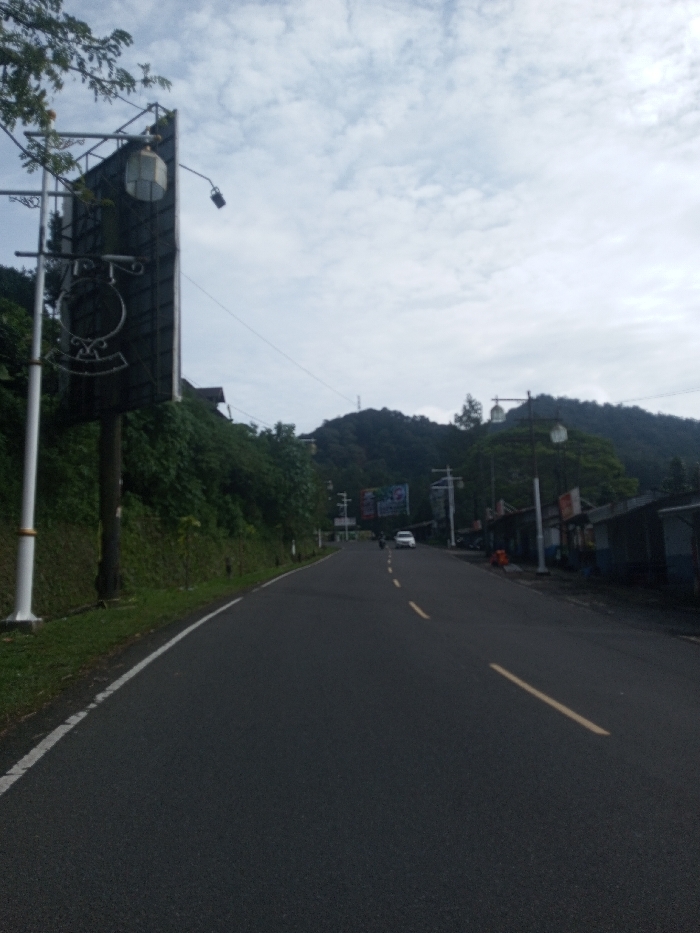 The image depicts an asphalt road curving slightly uphill through a rural-urban transitional area in Thanthirimale, Sri Lanka, under an overcast sky. The left edge of the road has a solid white line, and the center is marked by broken yellow lines. On the left, a white streetlamp pole supports a decorative element and the rear of a large rectangular billboard frame, with an attached lantern. Behind the pole, a steep, terraced embankment covered in green vegetation ascends. On the right side of the road, several single-story commercial or residential structures line the roadside, accompanied by multiple utility poles and streetlights. An individual in orange attire is partially visible near the structures on the right. A white sedan travels in the right lane, receding into the distance. The background is dominated by a densely forested mountain, featuring a visible white dome-shaped structure, likely a stupa, on its upper right slope, and a communication tower near its summit.
