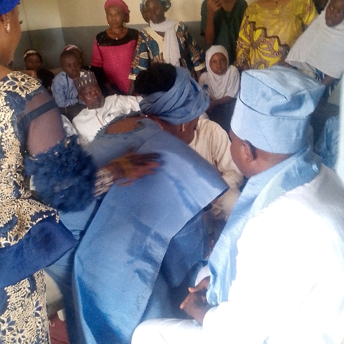 An indoor scene in Ozuri, Nigeria, depicts a gathering of approximately ten to fifteen individuals, predominantly adults with some children, within a room featuring light-colored walls. In the immediate foreground, to the left, a person is partially visible from the back, wearing a dark blue garment with gold embroidery and a textured sleeve. Their right hand, showing traces of henna, is extended forward. To the right foreground, another individual is seen from the back-right, dressed in a white tunic and a light blue traditional cap (Fila), with their hands clasped. At the center of the image, two individuals are engaged in an interaction. One person, with their back largely to the camera, wears a light blue headwrap and matching traditional attire, extending their left arm in what appears to be an embrace or supportive gesture towards another individual partially obscured opposite them. To the left of this central pair, an older man with a grey beard and a white traditional cap is seated, looking towards the camera. To the right, a young girl in a white hijab is also seated, observing the scene. The background contains several women standing, clad in diverse colorful Nigerian traditional garments and headwraps, alongside other adults and children seated or standing, observing the central activity.