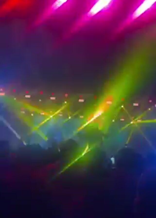 concert or music event. A crowd of people is visible from behind, with their heads and shoulders filling the lower part of the frame. The focus is on the stage, which is lit up with a variety of colorful lights, including blues, purples, and greens. There are spotlights and stage lights shining in different directions, creating a dynamic visual effect. A screen on the stage displays visuals. The overall atmosphere is energetic and vibrant.