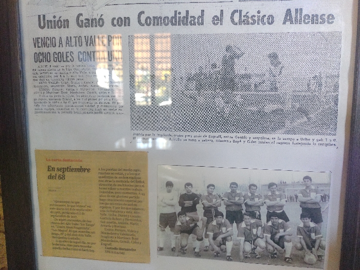 newspaper clipping from September 1968, titled "Unión Ganó con Comodidad el Clásico Allense." The article is about a soccer match between Unión and Alto Valle, with Unión winning 8-0. The headline is in large, bold type, followed by a smaller article. The clipping is mounted on a wall in a room, with a second, smaller clipping to the right. The second clipping is a photo of a soccer team, possibly the Unión team, with the caption, "En septiembre del 68." The location of the image is Allen, Argentina, which is at latitude: -38.978, longitude: -67.825. The image is printed on newsprint paper. The photograph in the second clipping shows a soccer team in uniform, standing in a line with their arms crossed and looking at the camera. Some players have their arms around each other's shoulders. The players are all wearing shorts and long-sleeved jerseys with numbers on them. The team appears to be posing for a team photo. The smaller image shows the team against a background of a grass field. The image is likely from a museum or historical archive in Allen, Argentina.