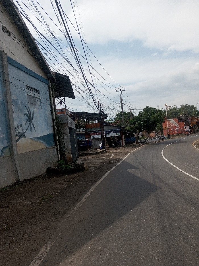 The scene depicts a daylight view of a street in Chhenangri_Rishor, Bhutan, under a cloudy sky. An asphalt road, marked with a white edge line, curves right and extends into the distance. Shadows of overhead infrastructure are cast onto the road surface. To the left, a light blue two-story building features a mural on its lower facade depicting a beach with palm trees, sand, and ocean waves. Above the mural, the building's upper section is white, with horizontal rectangular vents or windows. A dense, tangled network of black utility wires crisscrosses the upper frame, connecting to poles and structures. Adjacent to this building, a dirt and uneven ground area transitions to a more defined pedestrian path. A concrete structure with illegible graffiti or markings, featuring exposed rebar or support beams, stands near the corner. Behind this, a series of mixed commercial and residential structures line the road, characterized by varied construction materials including corrugated metal roofs and visible signage. Some structures appear to be undergoing construction or renovation. Further down the curved road on the right, a reddish-brown building with faded markings is visible. Trees with green foliage are present throughout the background. Multiple utility poles are interspersed along the street. In the far distance on the road, a single two-wheeled vehicle, likely a motorcycle or scooter, is observable. An ornate white pole, possibly a streetlight, stands on the right side of the road before the curve.