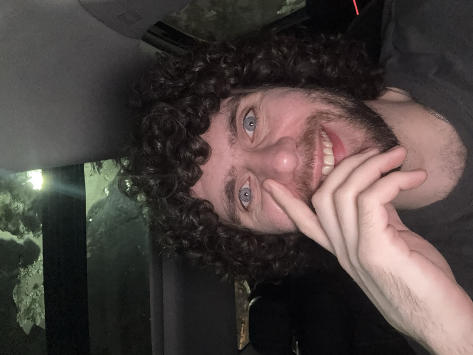 An adult male with dark curly hair, a beard, and light blue eyes is depicted in a close-up image, smiling broadly and exposing his teeth, while seated inside a vehicle at night