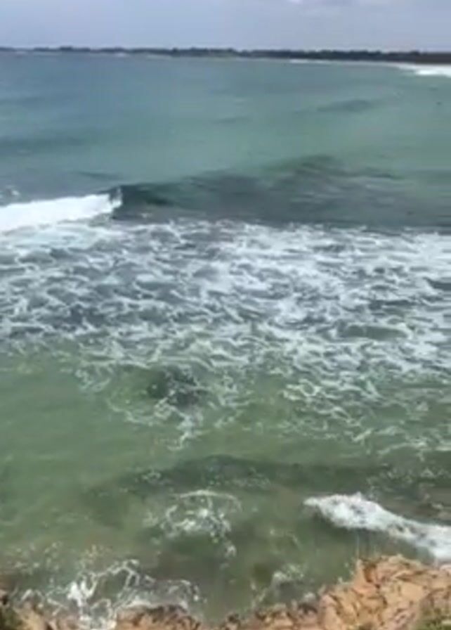 scenic view of a coastline from a high vantage point. The ocean is visible with waves crashing against the shore and rocks below. The water is a mix of turquoise and clear hues, with foam visible from the wave action. In the distance, there is a sandy beach lined with buildings. There are people walking on the beach and surfers in the water. The sky is partly cloudy with patches of blue. The foreground features rocky cliffs with some vegetation. The camera pans slightly to the right, offering a broader view of the coastline.