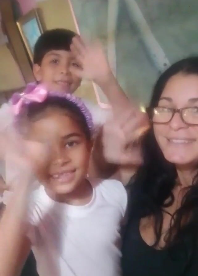 A selfie-style shot shows a woman in the foreground wearing glasses and a black top, smiling and blowing a kiss to the camera. Behind her to the left are two children: a younger girl with a purple headband and bow wearing a white shirt, and a slightly older boy also in a white shirt. All three people are waving at the camera. The background includes a wall with what appears to be a painting and part of a picture frame. The overall lighting is somewhat dim.