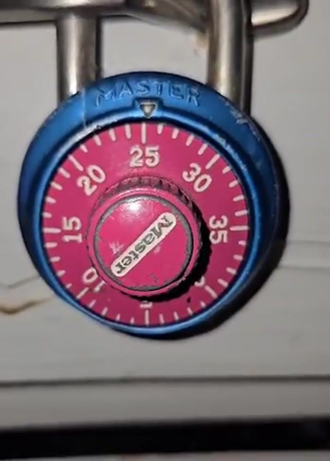 close-up shots of two different Master combination locks attached to a metal bar. One lock has a blue outer ring and a pink center dial, while the other lock is black and silver. The background appears to be a white surface with some stains. The camera angle slightly changes between the locks, showing them in different positions.