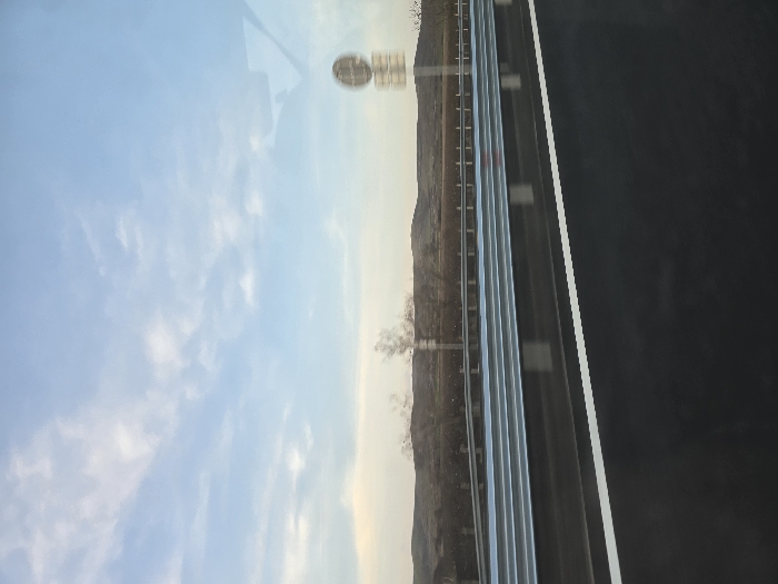 The image depicts a roadside scene near Chokoba, Bulgaria, viewed from what appears to be a moving vehicle. The foreground is dominated by dark asphalt pavement with a distinct solid white lane marker running horizontally along the right edge. Above the pavement, a triple-beam silver-colored metal guardrail stretches across the mid-ground, running parallel to the road. Beyond the guardrail, the landscape consists of sparsely vegetated, undulating hills under an overcast sky. Several bare, deciduous trees are visible between the guardrail and the distant hills. On the far right, a blurred, circular traffic sign on a pole is partially discernible, consistent with motion. The sky above is a pale blue with scattered white and light gray clouds, suggesting either early morning or late afternoon lighting. No individuals or active interactions are present within the frame.