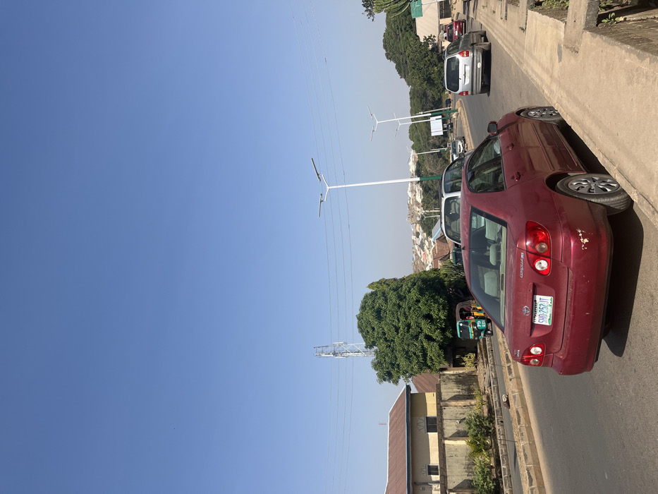 The image displays a daytime street scene in Jos, Nigeria, under a clear, pale blue sky. A dark red Toyota Corolla sedan, bearing Nigerian license plate "SHD-252 IT," is parked in the foreground, facing away from the viewer, with its right-side tires resting on a concrete curb and drainage ditch. The vehicle exhibits minor paint loss and damage on its rear bumper. To the left of the parked Corolla, an asphalt road curves slightly to the right, featuring a concrete median. Traffic is visible on the road, including a silver minivan behind the Corolla and a silver Opel Corsa moving in the distance. Further left, beyond the median, a light-colored building with a dark brown roof is partially visible behind a concrete wall, fronted by green shrubs. A large green-leafed tree stands prominently behind the wall, partially obscuring a green and yellow Keke Napep (motorized rickshaw) that appears to have two occupants. A tall metal lattice tower, likely a cellular mast, rises behind the tree. Several modern streetlights with dual-arm LED fixtures on tall white poles, some with green bands, line the road into the midground. The background features distant hills densely covered with numerous light-colored structures, consistent with a residential area, under a slight atmospheric haze. No direct human interaction or specific actions are discernible beyond vehicular movement and occupancy.
