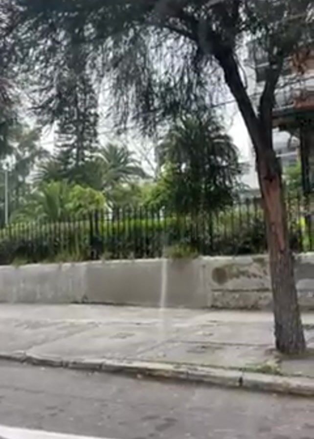 street scene viewed from a moving vehicle. A tree with sparse foliage stands beside a sidewalk marked with a large white arrow. Behind the tree is a low concrete wall topped with a dark green fence. Beyond the fence is a variety of greenery including palm trees and other plants, and then a multi-story building with a white facade and red brick accents. The sky is overcast. The overall impression is a somewhat urban environment, likely a residential or mixed-use area.