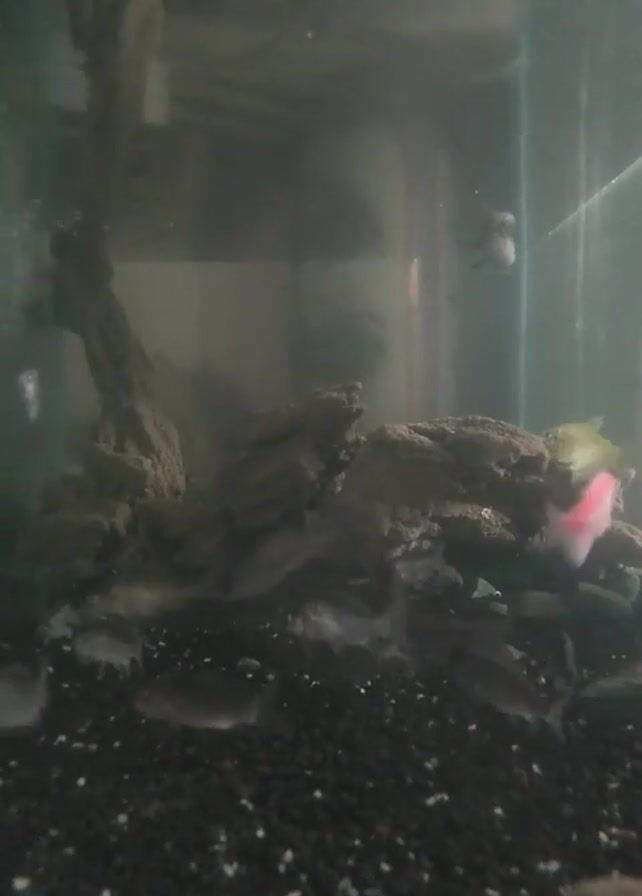 freshwater aquarium. The water is murky, obscuring some of the contents. At the bottom of the tank is dark gravel. An assortment of fish swim around the tank, including what appears to be a school of small, grey fish. A red fish and a yellow fish are also visible. There is a gnarled piece of wood and other rock-like decorations scattered throughout the tank.