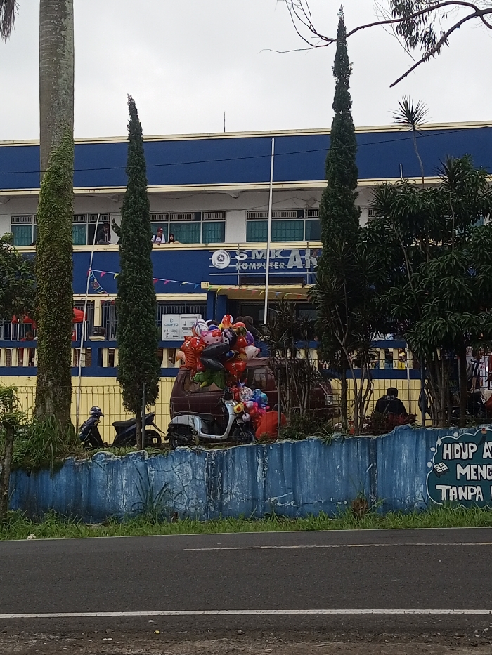 A two-story blue and yellow building with the words "SMK AB" on it is seen behind a row of tall trees and a low, blue wall. A brown vehicle laden with colorful balloons is parked in front of the building. Two motorcycles are parked nearby, and a person is seated on the ground. A street runs in front of the wall. The sky is overcast.