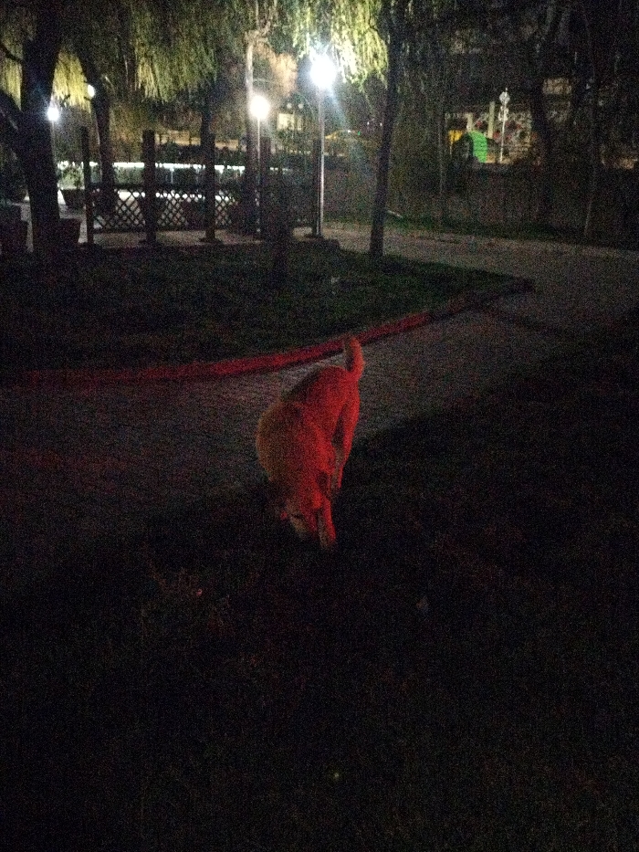 This nighttime image depicts an outdoor public area in Sandanski, Bulgaria. A medium-sized dog, exhibiting a reddish-orange coloration from an unseen light source, is positioned in the lower-center of the frame. The dog faces away from the viewer and slightly to the right, with its head angled downwards, consistent with an action of sniffing or examining the ground. The immediate foreground consists of a dark, unidentifiable ground cover, possibly grass or dirt. A paved pathway or sidewalk extends horizontally across the midground, with the dog positioned adjacent to it. A distinct horizontal band of red light is visible on or near this pathway, running parallel to it. The background features multiple trees with dark trunks and illuminated foliage, indicative of artificial lighting from overhead. Several bright streetlights on tall poles are prominently visible in the upper-left and upper-middle sections, providing significant localized illumination. Behind these trees and lights, a structure with a dark latticework or wooden fence is discernible, possibly part of a cafe or recreation area. Further to the right in the background, indistinct shapes suggest additional buildings or structures, exhibiting faint green and white accents. No human individuals are visible within the scene. The overall environment is dark, with strong contrasts created by the artificial light sources.