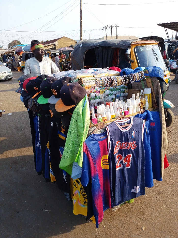 A vendor stands behind a three-wheeled vehicle overflowing with goods. Hats, clothing, jewelry, and small bottles are displayed. A Lakers basketball jersey and a Barcelona soccer jersey hang at the front. The vendor wears a white shirt and a colorful hat. Other people and vehicles are visible in the background, suggesting a busy market area. The sky is bright and clear.