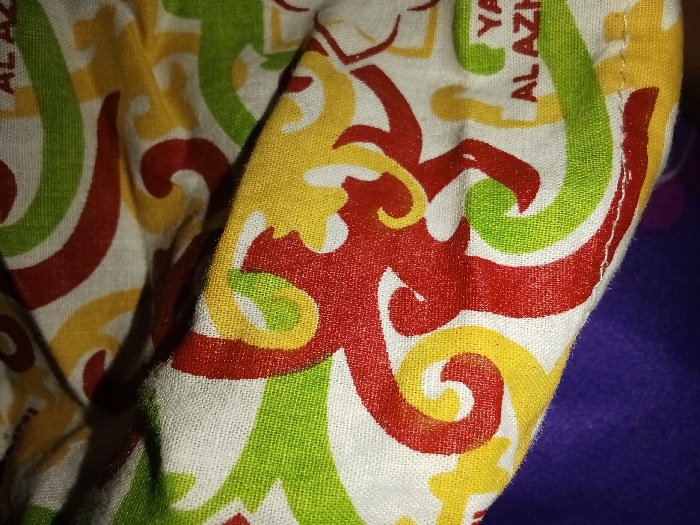 A close-up forensic image depicts a section of a patterned textile, likely fabric, exhibiting folds and creases. The primary design, set against a white background, features interlocking abstract curvilinear motifs in red, yellow, and green. Visible white text elements embedded within the pattern include fragmented characters forming "YASAN" and "AL AZH", referencing "Yayasan Al Azhar". The fabric texture is discernible, showing a fine weave. A dark purple, out-of-focus surface is visible in the background on the right. No individuals are present. This scene is situated in Ciputri, Indonesia.