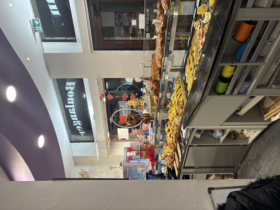 interior of a bakery. A long display case filled with various breads, pastries, and cakes occupies the right side of the frame. Behind the display is shelving with supplies. The bakery's name, "Boulanger", is visible on the shop's front window. A decorative circular display with a pretzel and a heart is placed behind the counter. The overall lighting is bright and inviting.