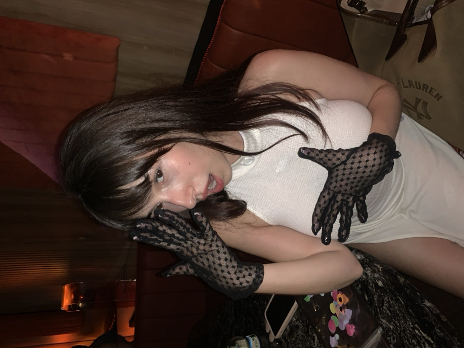 A woman with dark hair, bangs, and light skin, wearing a white dress and black, sheer gloves with a polka dot pattern, looks at the camera. She has one hand near her face and the other on her chest. A Ralph Lauren bag is visible in the background, along with a table with a phone, some items that look like confetti, and a can or bottle on it. The setting appears to be a dimly lit room, possibly a bar or lounge, with a textured wall behind her.