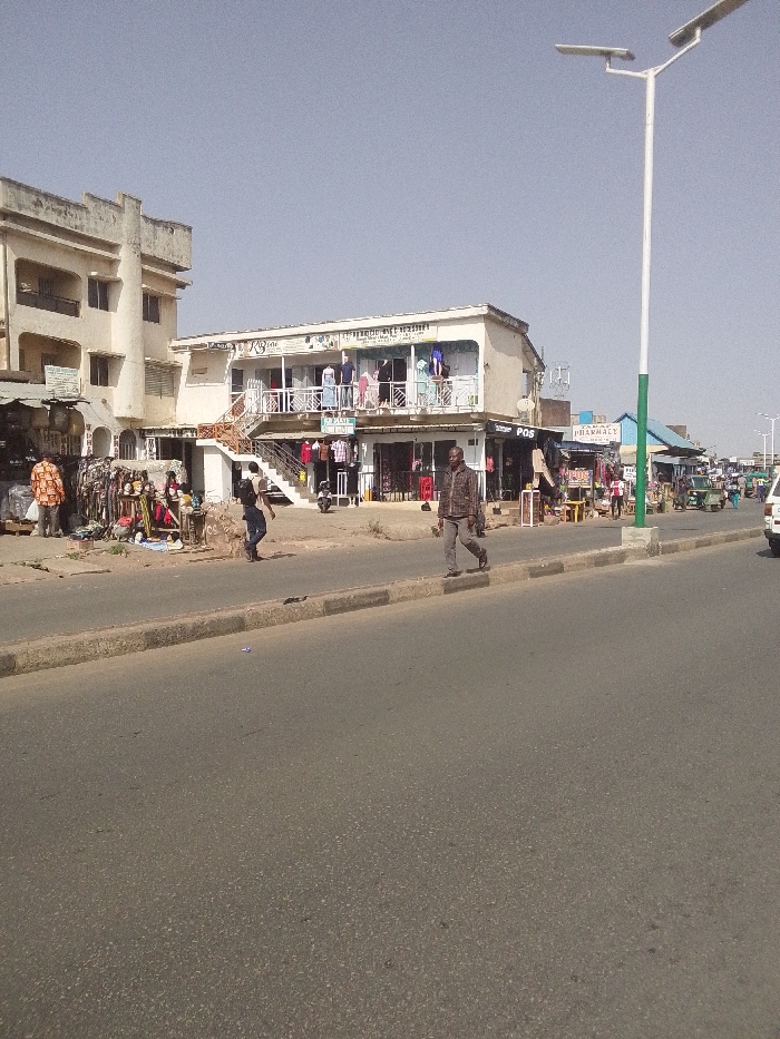 The image depicts a bustling street scene during daytime in a commercial area of Jos, Nigeria, under a clear, pale blue sky