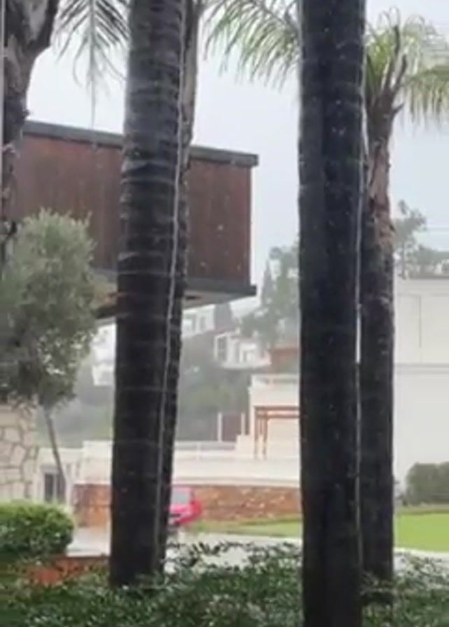 The video depicts a rainy scene, viewed through a window. Outside, several palm trees stand in the foreground, with large, upscale houses visible in the background. The houses are predominantly white with manicured lawns and landscaping. A glimpse of a red car can be seen near one of the properties. Raindrops are visible on the window, and the weather appears overcast and dreary. The camera pans slightly to showcase more of the houses and landscaping in the background.