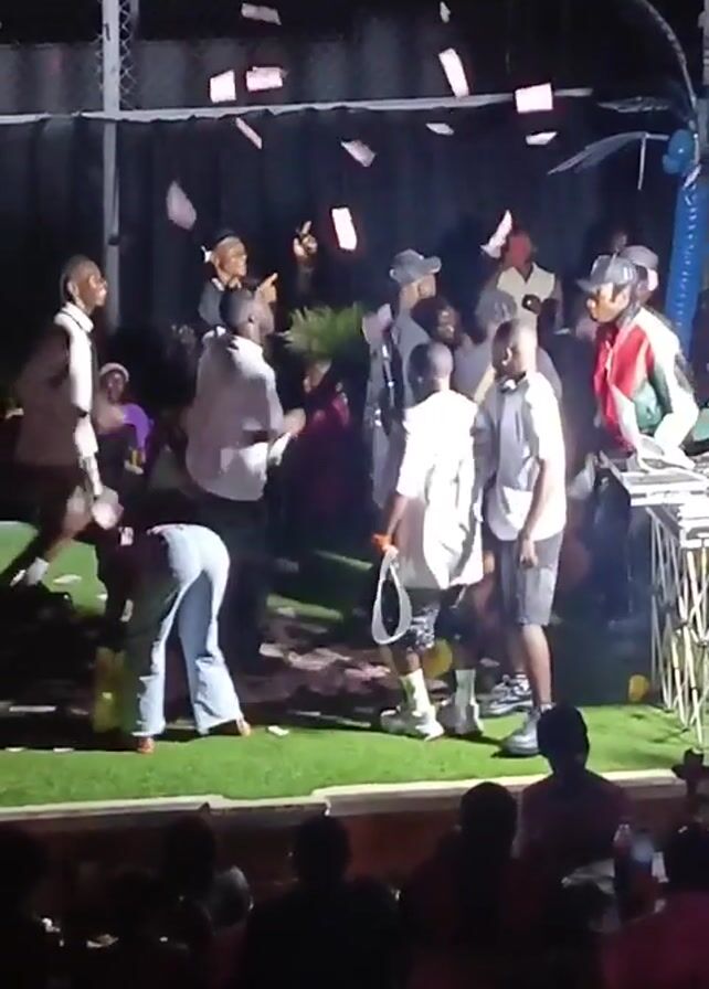 At night, a group of people gathers on a stage, illuminated by a spotlight. A performer at the center, wearing a white shirt and patterned pants, appears to be singing into a microphone while other individuals around them cheer and raise their hands in the air. Numerous pink pieces of paper, possibly money, are being thrown into the air and scattered across the stage. Some people are picking up the paper from the floor. In the background, there is a chain-link fence, dark foliage, and some illuminated decorative items. In the foreground, the backs of a seated audience can be seen, dimly lit.