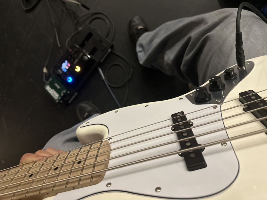 A close-up depicts a white electric bass guitar held by a person wearing grey pants. The guitar is plugged in with a black cable. In the background, slightly out of focus, is a black multi-effects pedal with illuminated buttons and an attached power cord. The setting appears to be indoors, possibly a studio or stage, given the dark flooring.