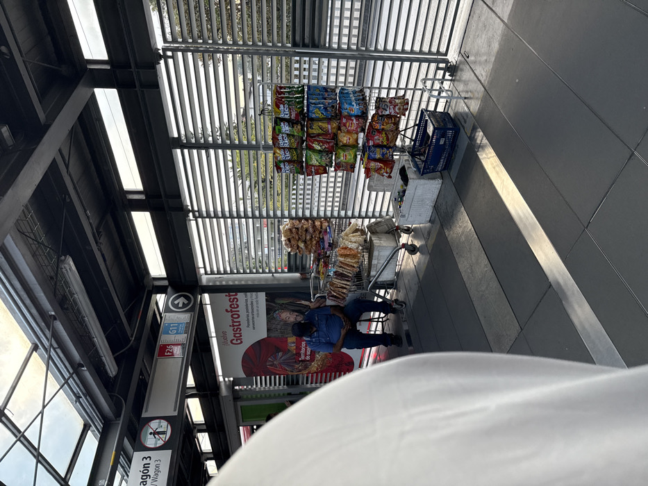 A vendor sits on a low stool, behind two shopping carts filled with various snacks, including chips and bagged goods. The vending setup is located in a covered area with metal grating overhead, resembling a transit station. A nearby sign promotes "Gastrofest." Another sign indicates the location of Wagon 3, suggesting a train platform. Sunlight streams in, creating strong light and shadow contrasts on the gray tiled floor. A white object obscures the bottom of the image.