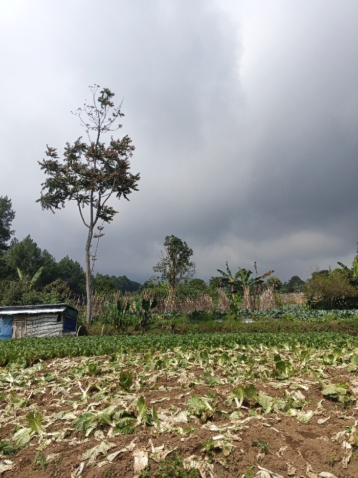 This image depicts an agricultural landscape in Ea Tê, Vietnam, under a heavily overcast sky. In the foreground, a field of reddish-brown soil contains rows of cultivated leafy green plants, some appearing partially harvested or damaged, consistent with cabbage or similar vegetables. Plant debris is scattered across the soil. To the left of the field, a tall, slender tree with sparse green and brown foliage stands prominently. Adjacent to it on the left, a small, utilitarian structure is visible, constructed from light-colored wooden planks with a dark, possibly corrugated metal roof and blue tarp material partially covering its exterior. Further left, a stand of coniferous trees appears. The midground features additional cultivated areas with denser green crops, followed by taller vegetation including banana plants and other stalky crops, possibly sugarcane or corn, arranged in rows. A narrow, dark linear feature, likely an irrigation ditch, is discernible amidst these plantings. The background consists of a densely forested hillside or mountainous terrain, dark green under the prevailing light conditions. The sky is entirely overcast, with shades ranging from light gray overhead to darker, more ominous clouds on the right side, suggesting impending rain or stormy weather. No human figures or discernible activities are present in the scene.