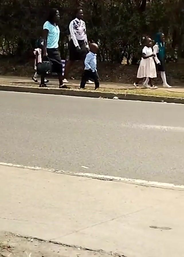 A group of five adults and three children walk along a sidewalk adjacent to a road. The adults appear to be escorting the children. The adults are dressed in casual clothing, while the children are wearing dresses and dress shirts. A hedge runs along the edge of the sidewalk, bordering the road. Some scattered litter is visible in the street. One of the children is running slightly ahead of the group. The sun is out, providing bright light.