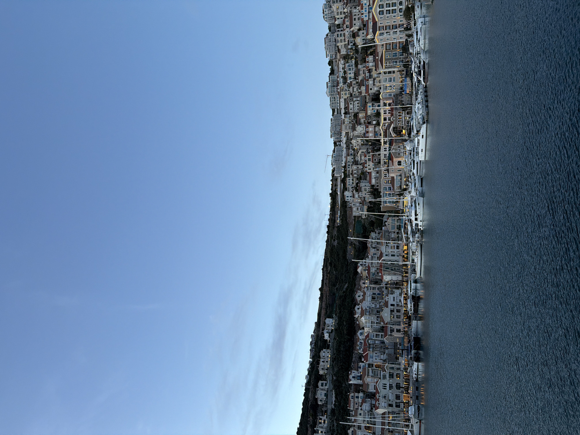 view of Lustica Bay in Radovići, Montenegro. The scene features a hillside densely populated with multi-story buildings along a waterfront. Many boats are docked along the waterfront. The sky is a light blue with some wispy clouds. The water is dark, with slight ripples visible on the surface.