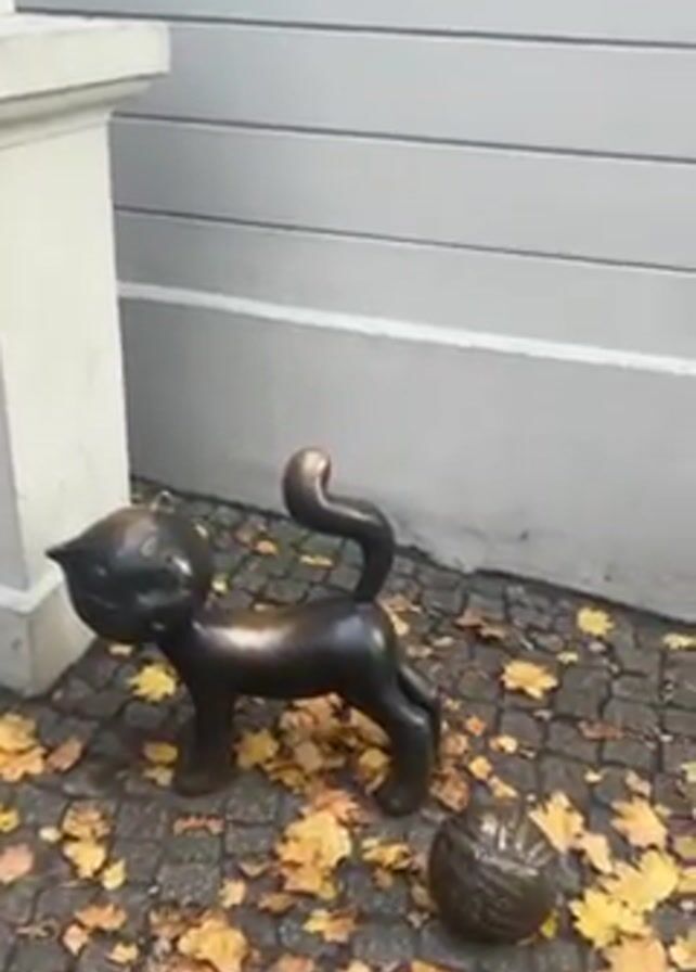two cat statues in an outdoor setting. One bronze-colored statue of a cartoon cat is standing on a cobblestone path with yellow leaves scattered around. Next to the cat statue is a bronze-colored ball of yarn. The camera then pans upward to reveal a grey statue of a cartoon cat standing on the top of a low, white wall. Beyond the wall are trees with yellowing leaves and a blue sky.