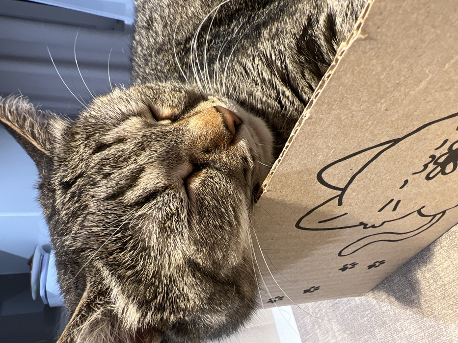 A brown and grey striped tabby cat is depicted resting, eyes closed, with its head positioned on the upper edge of a corrugated cardboard box