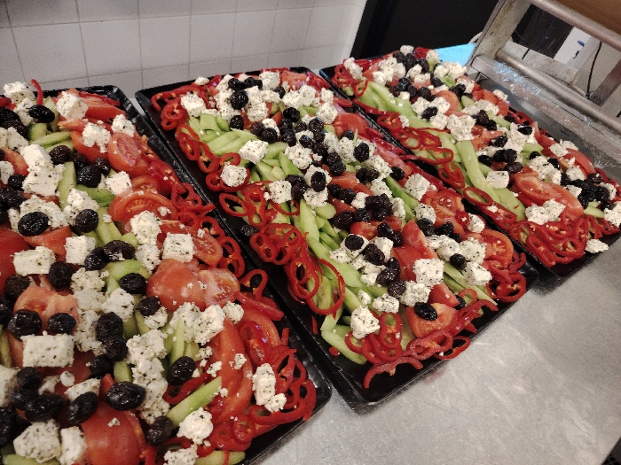 - "The image depicts four oblong black serving trays, each containing a prepared salad consistent with a traditional Shopska salad, positioned on a metallic countertop within a food preparation establishment in Sofia, Bulgaria" by FM-FewHw2, licensed under CC BY 4.0