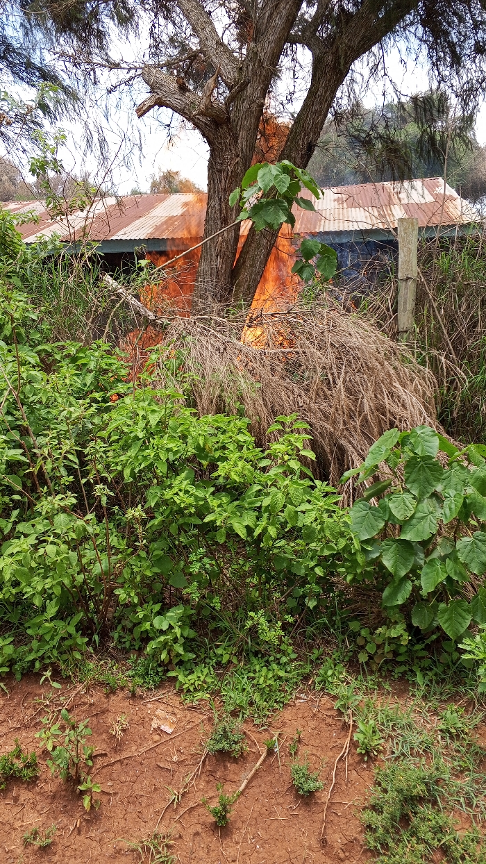 In Ndeiya, Kenya, an active fire is depicted, originating from a substantial accumulation of dry brush positioned between a large, multi-trunked tree and a single-story building