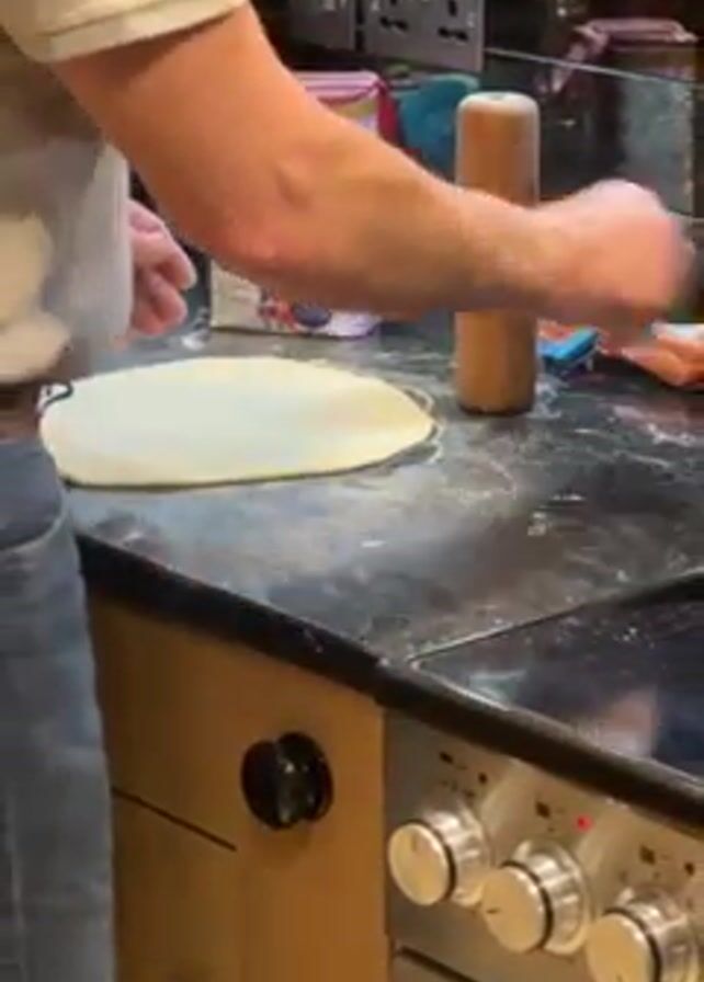 A person is seen preparing dough. The person uses a rolling pin to flatten the dough, picks up a pizza pan, and lays the dough on the pan. They appear to be in a kitchen, as an oven and kitchen cabinets are visible. There is also a box of Tate & Lyle sugar on the counter.