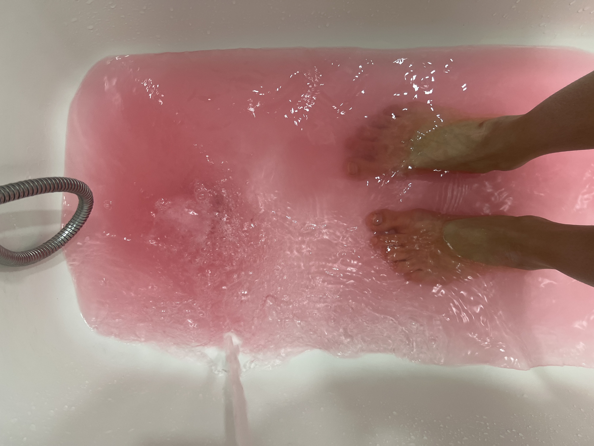 A top-down, close-up shot shows a white bathtub filled with pink water