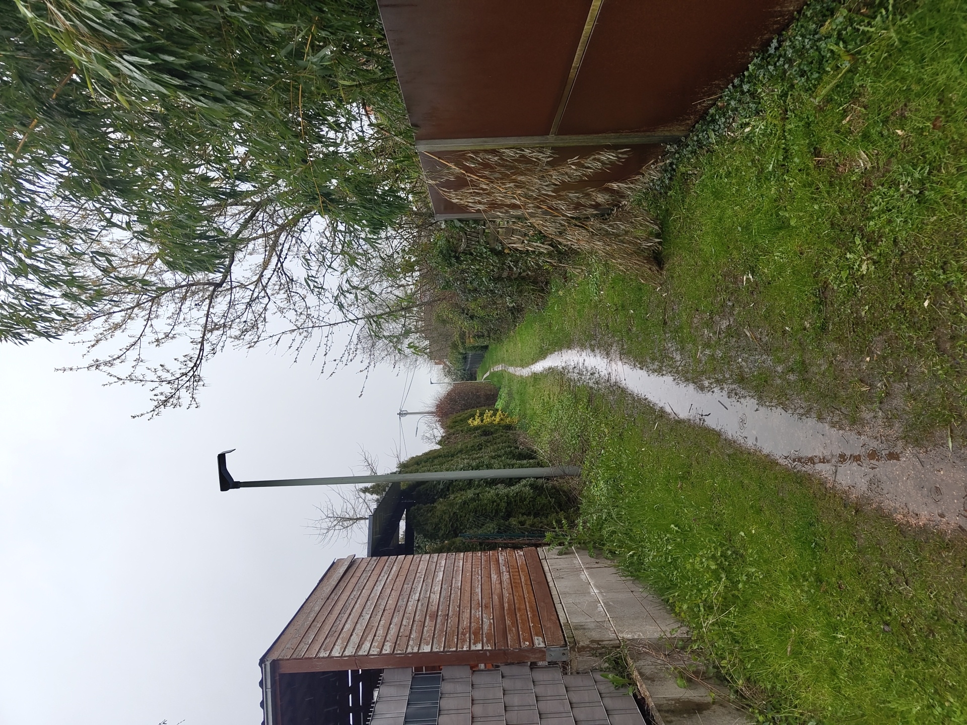 The image depicts a muddy, waterlogged path running between a rusty metal fence and a wooden structure with a concrete foundation