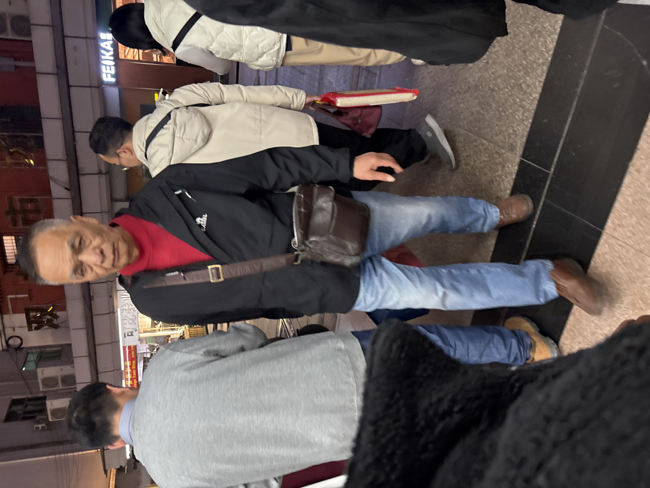 The image captures an urban street scene in Yuexiu District, China, under artificial illumination, indicating evening or night conditions. The central figure is an East Asian male, appearing elderly, with short grey hair. He wears a red turtleneck shirt, a black outdoor jacket featuring a white "CAMEL" logo on the left chest, light blue denim jeans, and brown leather shoes. A dark brown leather shoulder bag with a brass-colored buckle on its strap is slung across his body. He is depicted in mid-stride, moving forward, with his gaze directed toward the camera. To the left and slightly behind the central figure, the back of another male is visible, wearing a grey long-sleeved shirt, light blue jeans, and tan work boots. In the right background, a male figure wearing a light beige or cream hooded puffer jacket, dark trousers, and grey athletic shoes is seen walking away, carrying a red and white bag in his right hand. Adjacent to him, a female figure in a white quilted vest is partially visible. The lower-left foreground is occupied by a dark, textured object or garment. The ground surface consists of light and dark grey square tiles. The background features building facades with visible air conditioning units and areas of red-brick-colored material. Overhead signage includes partial Chinese characters and the English words "Train Shop" on the left, and the English word "FEIKAS" in white capital letters on a dark background on the right.